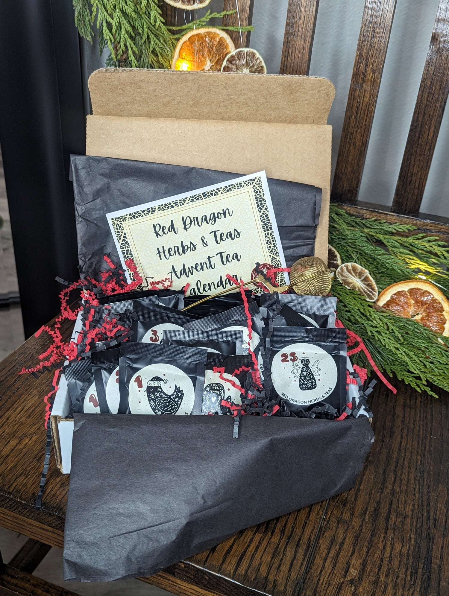 You’ve been asking for years!! We did it, Advent Tea Calendar is here!! Have you always wanted to try a few of our blends or gift some to a friend but not sure what you or they might like? This is a great opportunity to enjoy 25 different blends handcrafted at Red Dragon Herbs & Tea.